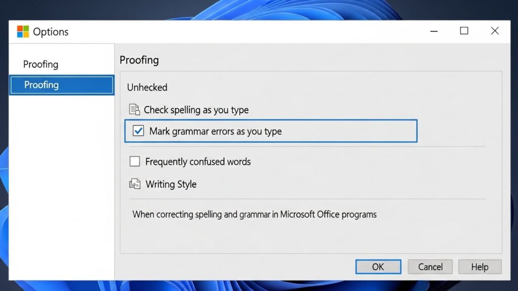 2. 파란 밑줄은 ‘문법 및 서식 오류’ 체크를 끄면 사라집니다.
