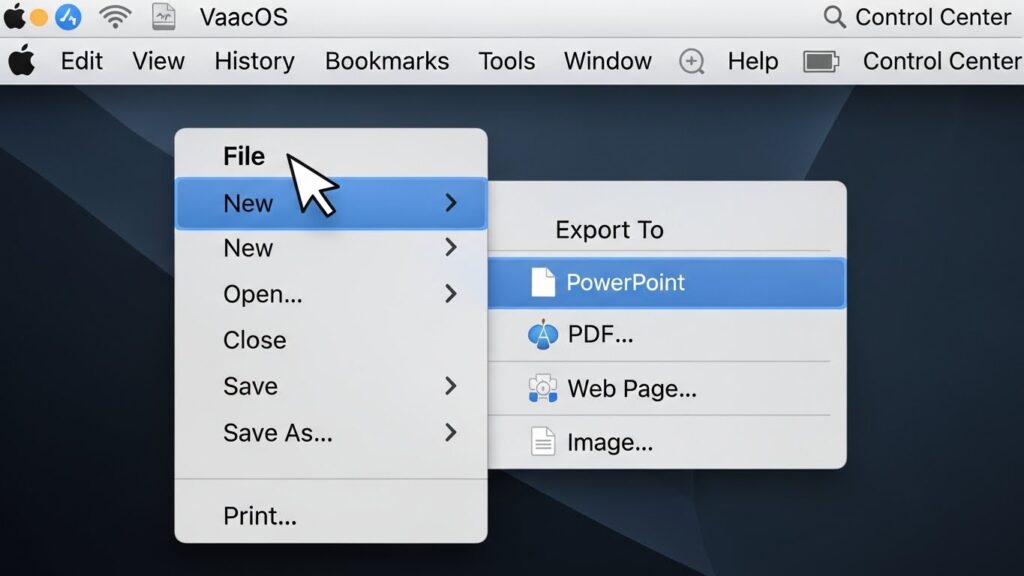 - 다음으로 내보내기 선택: 메뉴 중 다음으로 내보내기(Export To) → PowerPoint를 순서대로 누릅니다.