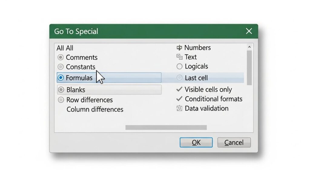 예를 들어, 숫자만 싹 지우고 싶다면 [상수]를 선택하고 하위 옵션에서 ‘숫자’만 체크하면 됩니다. 반대로 수식이 걸린 중요한 셀만 찾아서 보호를 걸거나 색칠을 하고 싶다면 [수식]을 선택하면 되죠.