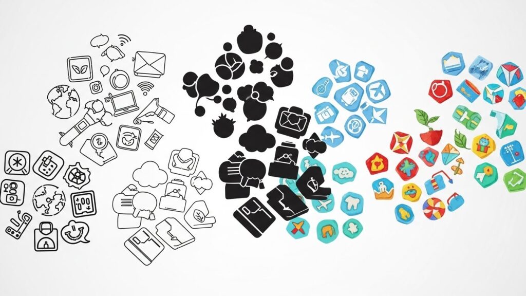 단순한 흑백 아이콘부터 컬러풀한 일러스트 형 아이콘까지 스타일이 다양해 선택의 폭이 넓습니다.